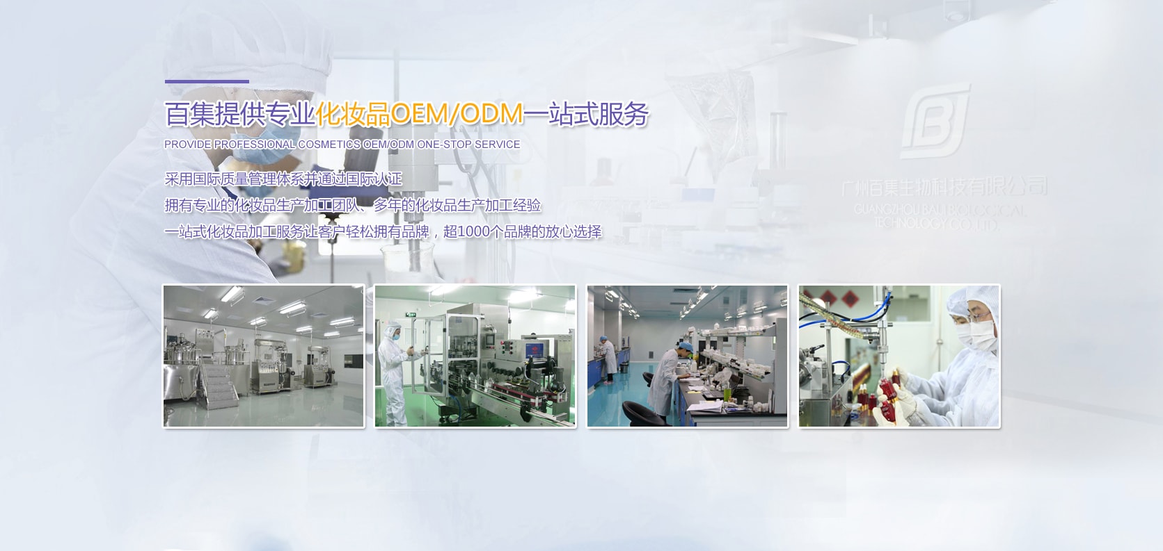 廣州市百集生物科技有限公司成立于2012年,坐落在亞洲化妝品硅谷的廣州市白云區,是一家具有現代化管理、專業化水準的化妝品研發及制造基地,為客戶提供專業的OEM/ODM一站式服務,涵蓋產品規劃、配方開發、包裝設計、功效測試、乳化、灌裝、包裝、倉儲物流等全方位服務。產品涵蓋各類化妝品水、乳、霜、膏、面膜、精華、BB霜、CC霜、素顏霜、精油及粉類等成品及半成品,涵蓋日化線及專業線配方。公司秉承“創新、共贏”的核心價值觀......
